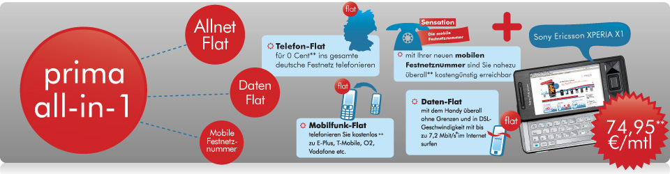 Die Online-Mobilfunk-Tarife von primacall sind ganz auf die Wünsche und Telefongewohnheiten unterschiedlicher Anspruchsgruppen zugeschnitten. Mit verschiedenen Kontingenten an Inklusivminuten und attraktiven Minutenpreisen ins deutsche Festnetz sowie in alle deutschen Mobilfunknetze kann jeder selbst entscheiden, welcher Tarif am Besten zu ihm passt. Nutzen Sie den Online-Vorteil und entscheiden Sie sich jetzt für die unglaublich günstigen primacall-mobile-Tarif.